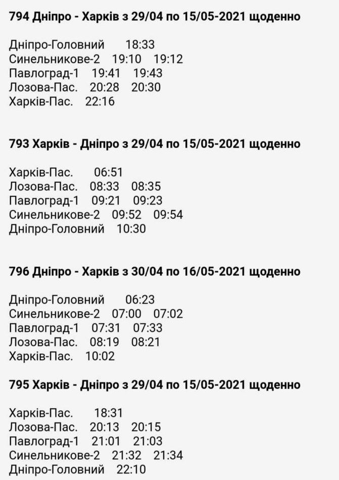 Поезд №793/794 «Харьков-Днепр-Харьков» из Харькова будет отправляться в 6:51, время прибытия в Днепр - 10:30 (на станции Павлоград-1 он в 09:21-09:23). С Днепра поезд будет отправляться в 18:33, время прибытия в Харьков — 22:16 (на станции Павлоград-1 он в 19:41-19:43).