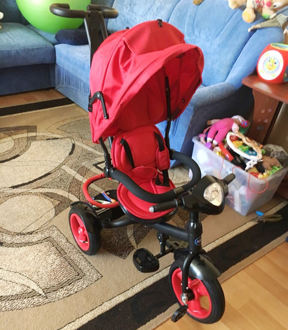 Трехколесный велосипед колясочного типа красного цвета на надувных колесах Neo 4 Air. Велосипед имеет фару и музыкальную панель.