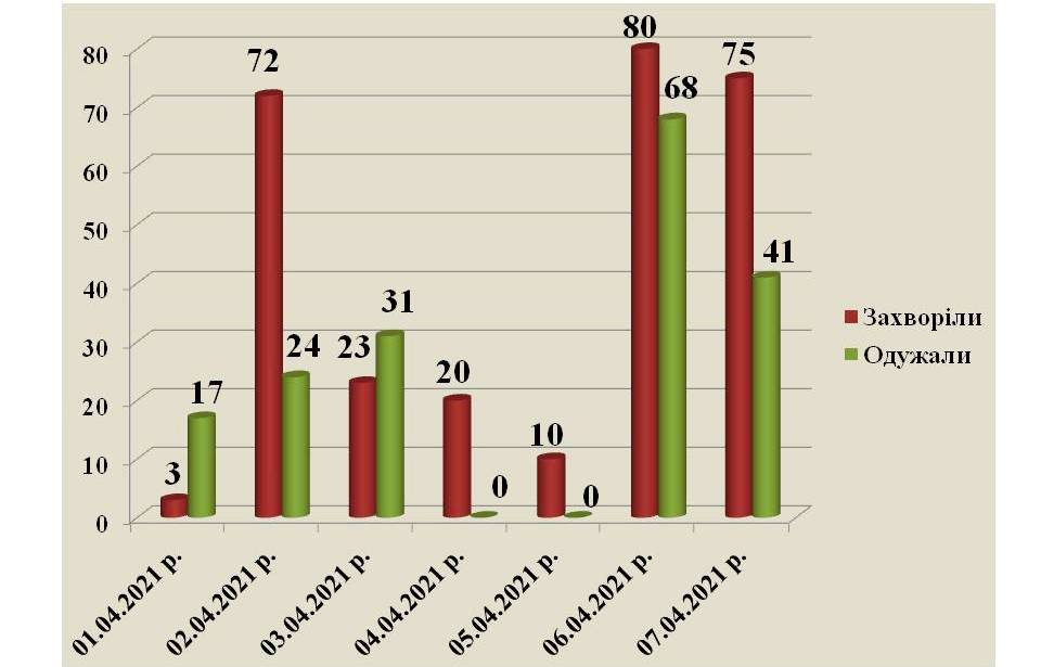 По Павлограда состоянию на утро 7 апреле зафиксирован 75 новых случаев COVID-19. Выписано с выздоровлением - 41 пациент. Всего под наблюдением врачей находится 566 пациентов, из них 42 ребенка, 507 человек лечится амбулаторно в центре первичной медико-санитарной помощи.