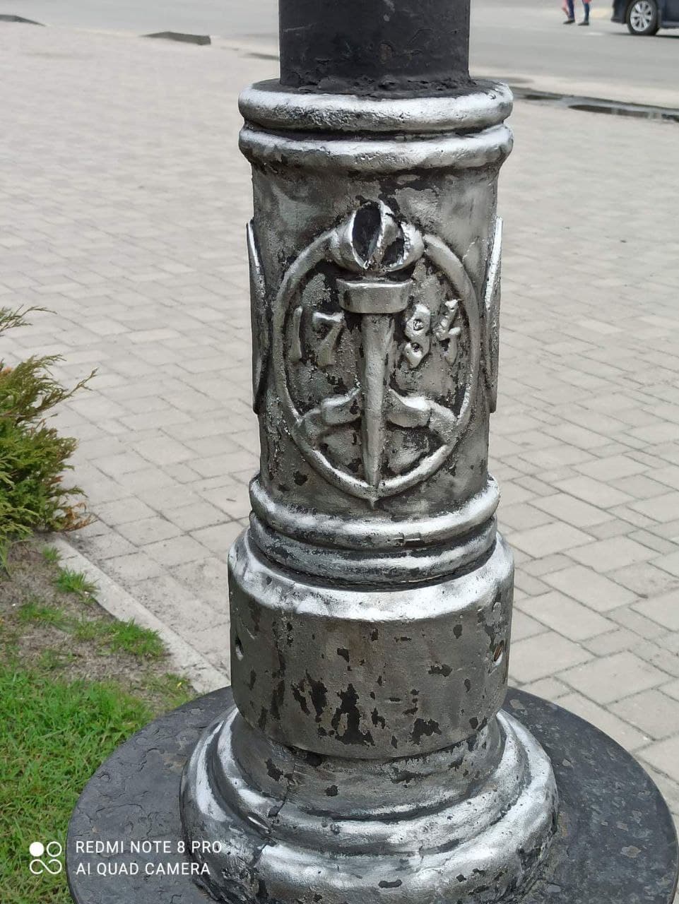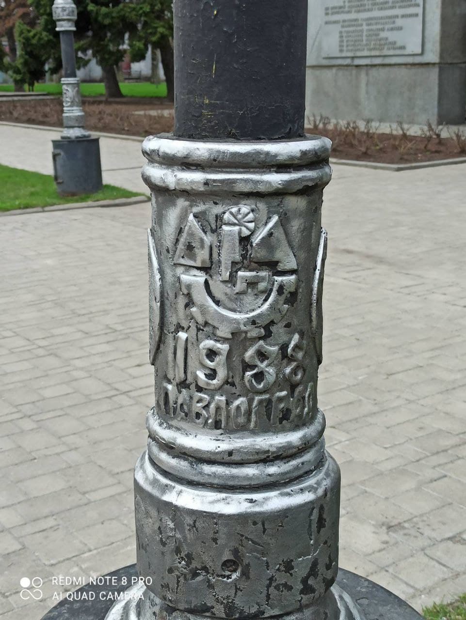 На Аллее славы в центре Павлограда продолжаются работы по ее реконструкции. И несколько дней назад сотрудники КП «Павлоград-Свет», счищая слои краски с фонарных опор, обнаружили необычную находку. Из-под слоя черной краски проступили винтажные объемные фигуры: с одной стороны факел с датой основания города (1784 г.), с другой - герб Павлограда периода СССР и 1988 год (вероятнее всего дата установления фонарей).